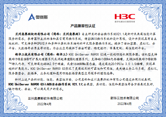 兰州奥赛斯软件有限公司和新华三技术有限公司通过共同测试表明,新华三H3C UniServer R6900 G3与AOS安全操作系统 V21.1完全兼容,其功能、性能和兼容性等各方面表现良好,运行稳定、安全,可以满足用户的需求。